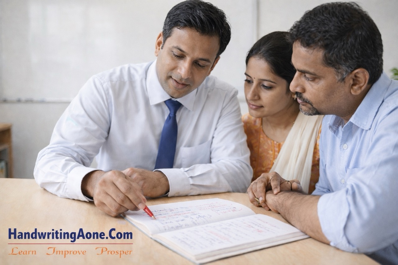 Handwriting expert evaluating a student's writing with parents during a free handwriting assessment session at HandwritingAone.com, Vijayanagar, BangaloreWriting slowly in exams?