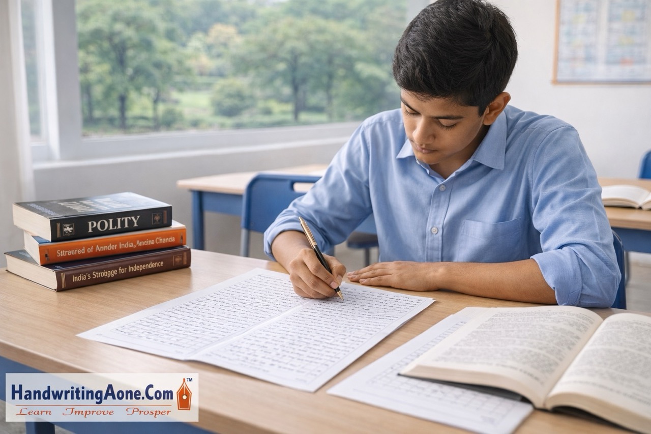 Student practicing neat handwriting for exam preparation during handwriting improvement course in Bangalore at HandwritingAone.comIn addition to school and college students, HandwritingAone has been consistently guiding competitive exam aspirants across Bangalore and Karnataka who are preparing for UPSC, KPSC and other Public Service Commission examinations. In Mains examinations, handwriting clarity, structured presentation and writing speed play a crucial role in securing higher marks. Many aspirants struggle to complete lengthy answer papers within time limits or lose marks due to unclear presentation. Our specialized training focuses on improving English handwriting, Kannada handwriting, answer structuring techniques and speed writing strategies specifically tailored for competitive exam Mains papers. Students from different parts of Bangalore and across Karnataka join our institute to strengthen their writing clarity, improve writing stamina and enhance overall presentation skills, giving them greater confidence during high-pressure examinations.