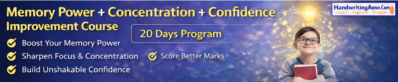 2026 – English Handwriting Improvement + Speed Writing + Memory Power + Concentration + Self Confident Improvement Course India – One Month Course – 20 Sessions – One hour per class – For School Students above 9 years – IV, V, VI, VII, VIII, IX, X Std, College Students – I PUC, II PUC, Diploma, B.Sc., B.Com, BA., BE, MBBS, ME, B.Tech, M.Tech, LL.B, , Competitive Exam Students – PSI, KAS, KPS, IAS, IPS, IFS, IRS, Banking Students – Daily Classes, Weekend Classes, Fast Track Classes Available – Morning or Evening Batches – Anybody in India and across the world can Join – After Handwriting Assessment, Improvement Assured.