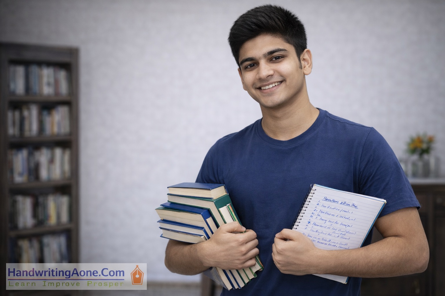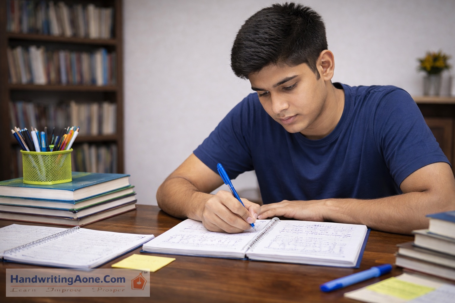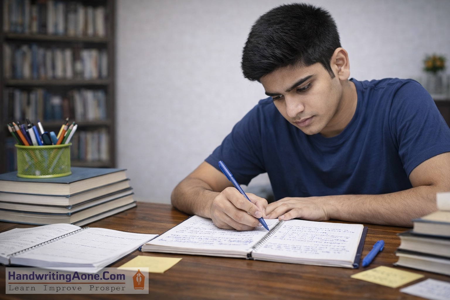 teenage student stressed while studying with many books and notes on deskAs a handwriting and academic skill expert, I frequently observe: