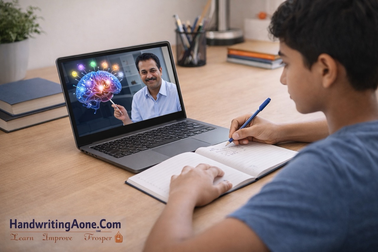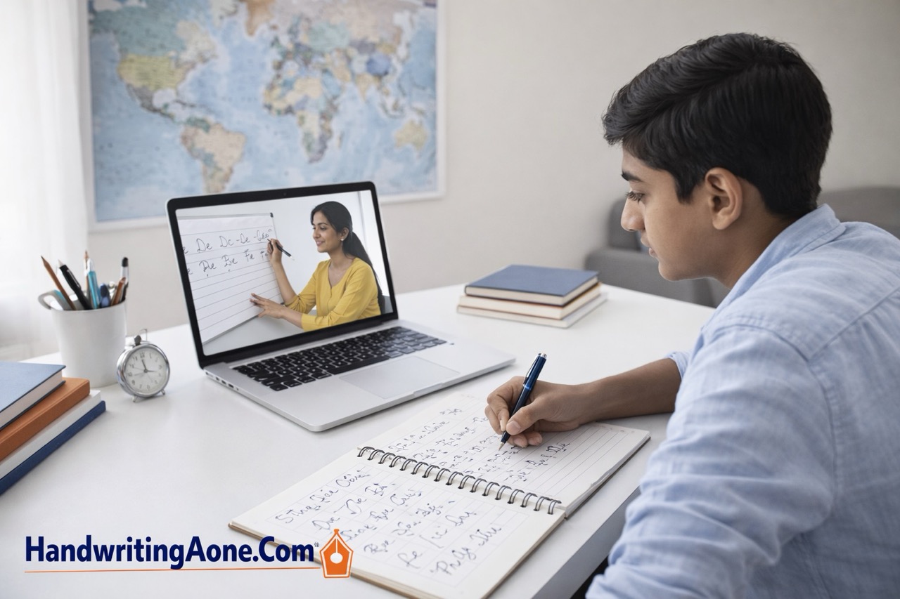HandwritingAone offers a structured and result-oriented Online English Cursive Handwriting Improvement & Speed Writing Course for students across India and Indian students studying abroad. This live interactive online program helps students improve handwriting neatness, writing speed, letter formation, spacing and overall presentation skills from the comfort of their home.